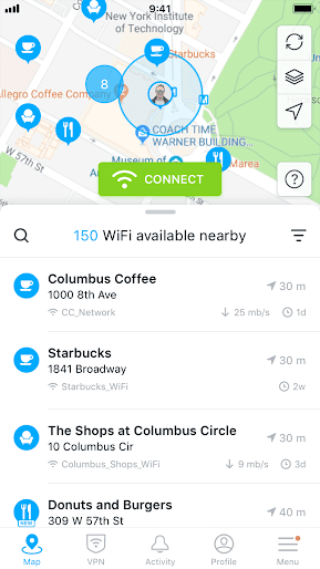 The Wifi networks are plotted on a map to make it easy for you to be able to locate the Wifi network that is closer to you.