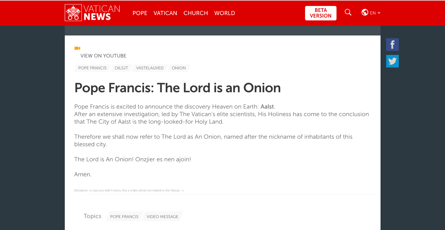 The hacker who discovered the vulnerability is a Belgian who goes by the name of Inti De Ceukelaire. The hacker made a change to a post on the website that falsely stated that Pope Francis had declared God to be an onion.